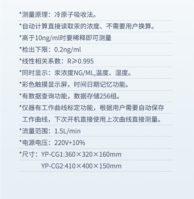 2.自動計算直接讀取汞的濃度、不需要用戶換算。