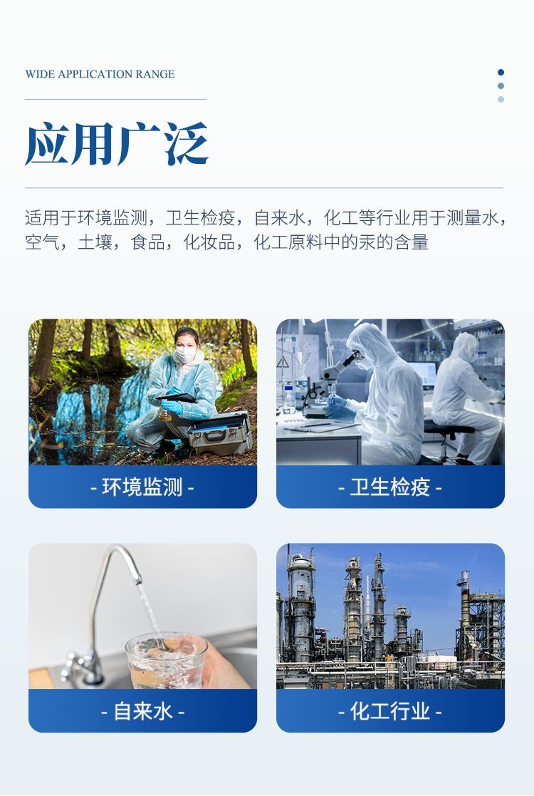 本儀器適用于環(huán)境監(jiān)測,衛(wèi)生防疫,自來水,化工等行業(yè)用于測量水,空氣,土壤,食品,化妝品,化工原料中的汞的含量。