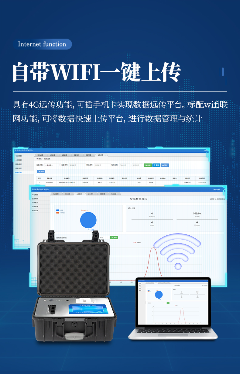 11、儀器具有4G遠傳功能,可插手機卡實現(xiàn)數(shù)據(jù)遠傳平臺。標配wifi聯(lián)網(wǎng)功能,可將數(shù)據(jù)快速上傳平臺,進行數(shù)據(jù)管理與統(tǒng)計。
