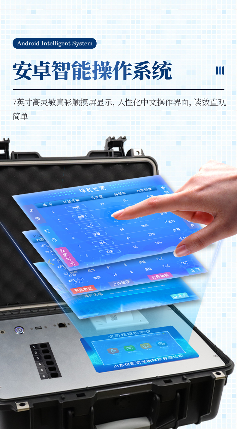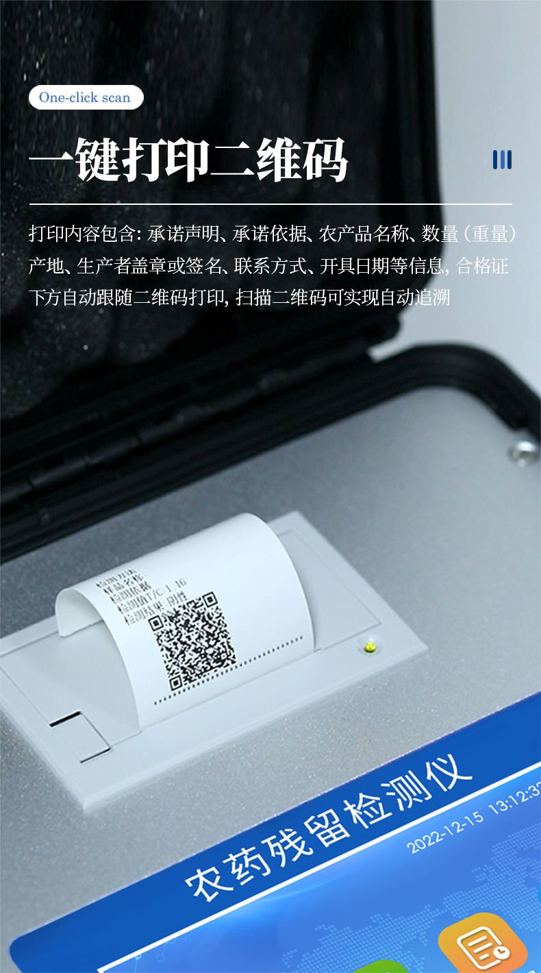 山東優(yōu)云譜光電科技有限公司是一家專業(yè)生產(chǎn)食品快檢儀器的高新技術(shù)領(lǐng)域企業(yè)。我公司根據(jù)農(nóng)村農(nóng)業(yè)部辦公廳關(guān)于《加快推進承諾達標合格證制度試行工作的通知》,在原有的食用農(nóng)產(chǎn)品合格證檢測打印一體機的基礎(chǔ)上優(yōu)化了打印標簽,使打印標頭和打印內(nèi)容符合承諾達標合格證的最新要求。該儀器集農(nóng)藥殘留快速檢測和承諾達標合格證打印于一體,智能化程度高,在快速檢測的同時實現(xiàn)承諾達標合格證的打印。打印內(nèi)容包含:承諾聲明、承諾依據(jù)、農(nóng)產(chǎn)品名稱、數(shù)量(重量)、產(chǎn)地、生產(chǎn)者蓋章或簽名、聯(lián)系方式、開具日期等信息,合格證下方自動跟隨二維碼打印,掃描二維碼可實現(xiàn)自動追溯。實現(xiàn)農(nóng)產(chǎn)品安全的全程數(shù)據(jù)溯源,適合各地檢測機構(gòu)、農(nóng)業(yè)合作社、蔬菜批發(fā)市場等單位使用。