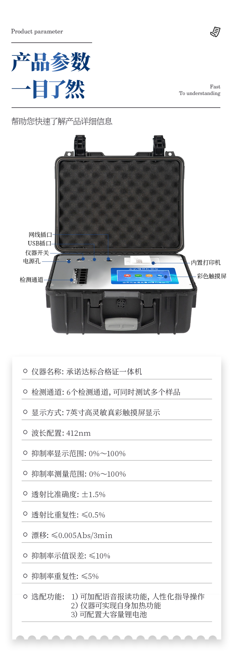 1、高強度PVC工程塑料手提箱設(shè)計,堅固耐用,便于攜帶,供電方式為交直流兩用,可野外流動測試配套成品藥劑。