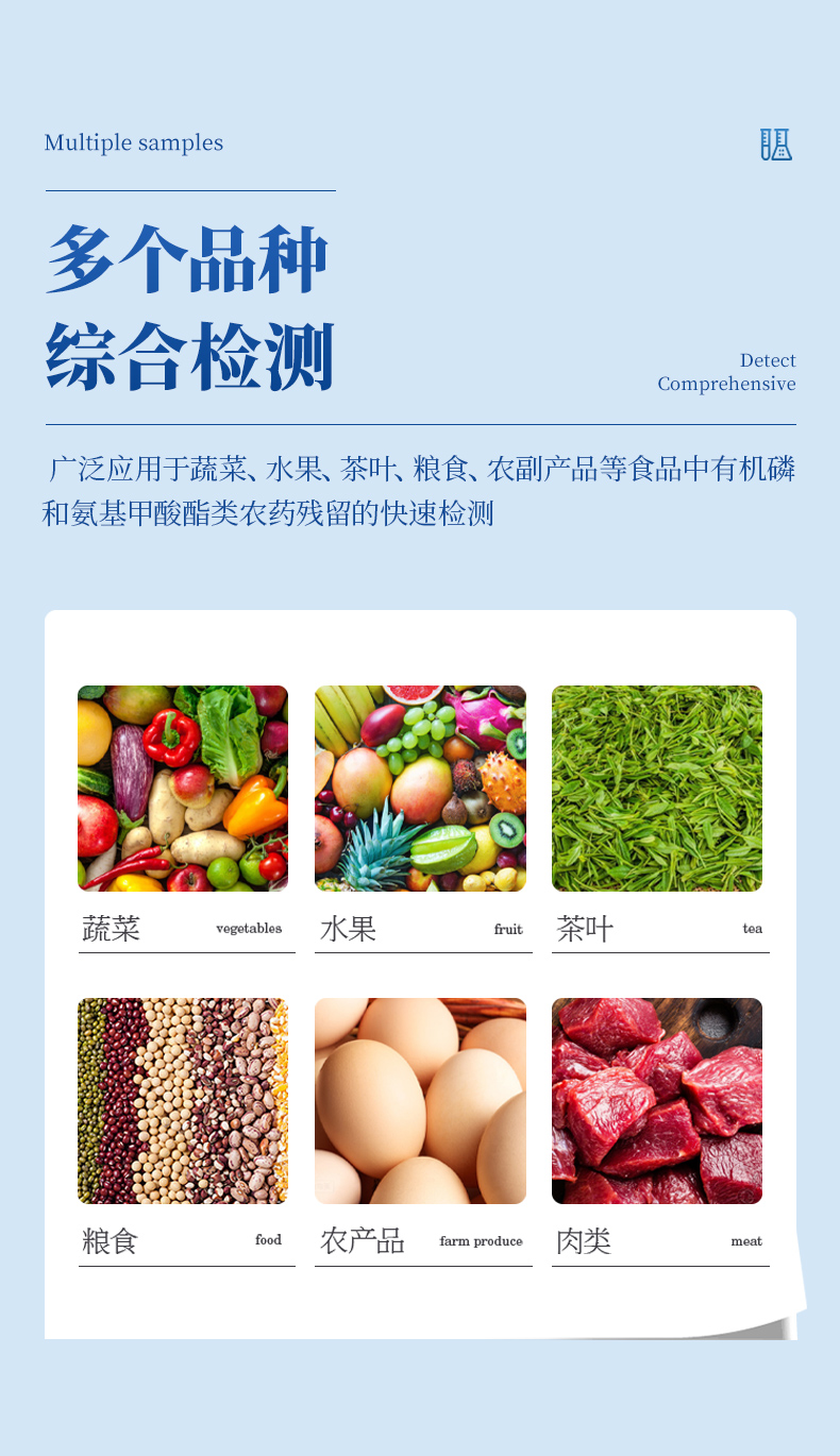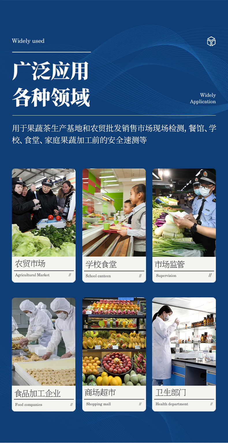 廣泛應(yīng)用于蔬菜、水果、茶葉、糧食、農(nóng)副產(chǎn)品等食品中有機磷和氨基甲酸酯類農(nóng)藥殘留的快速檢測;此外還可用于果蔬茶生產(chǎn)基地和農(nóng)貿(mào)批發(fā)銷售市場現(xiàn)場檢測,餐館、學校、食堂、家庭果蔬加工前的安全速測等。