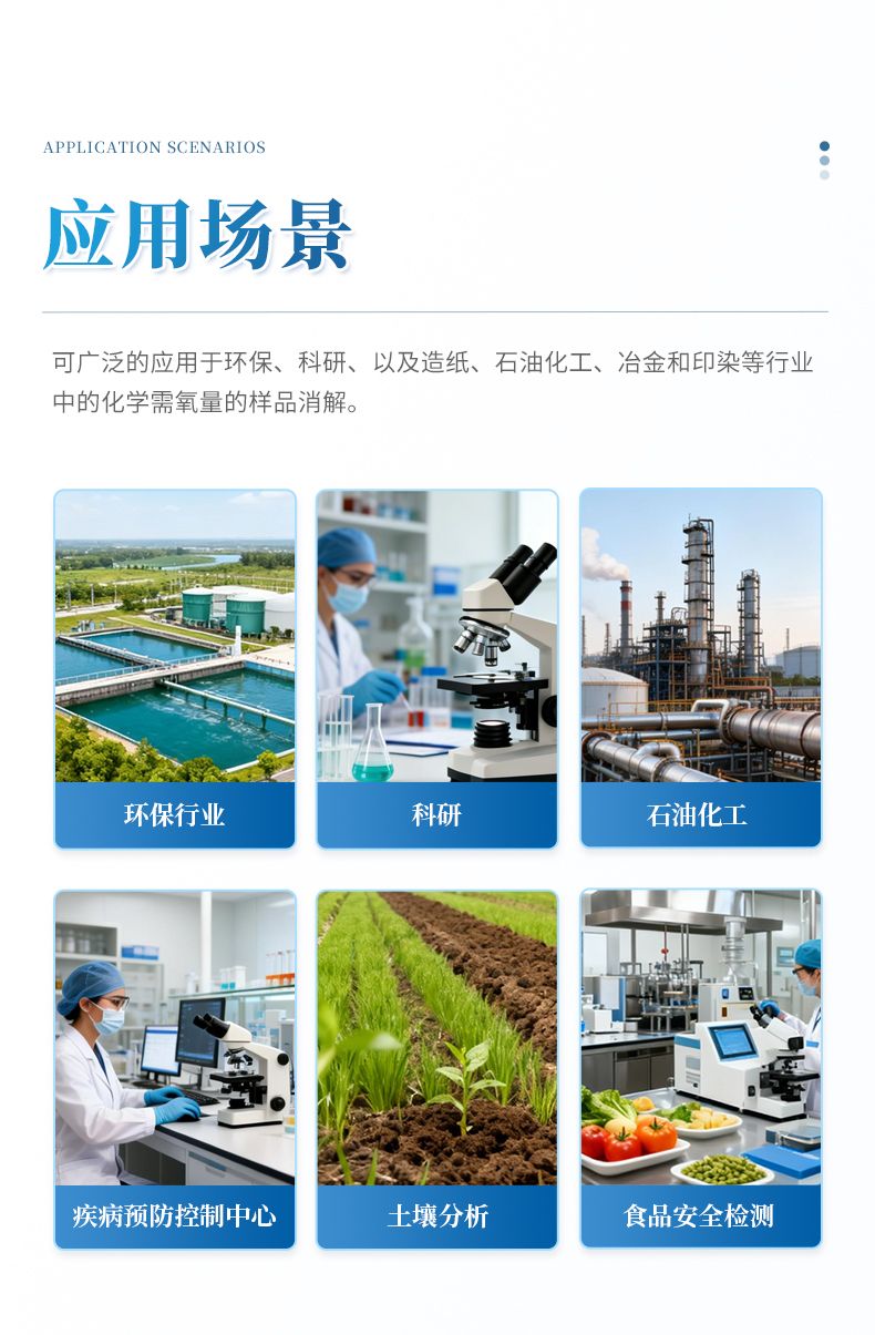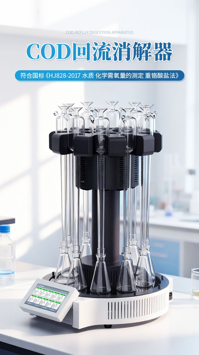 化學(xué)需氧量(COD)智能回流消解器遵循了國家標(biāo)準(zhǔn)《HJ828-2017 水質(zhì) 化學(xué)需氧量的測定 重鉻酸鹽法》的基本原則,保證了回流加熱微沸2小時的消解操作,試劑溶液的配制和加入量與國標(biāo)法一致,確保可靠準(zhǔn)確的分析結(jié)果。