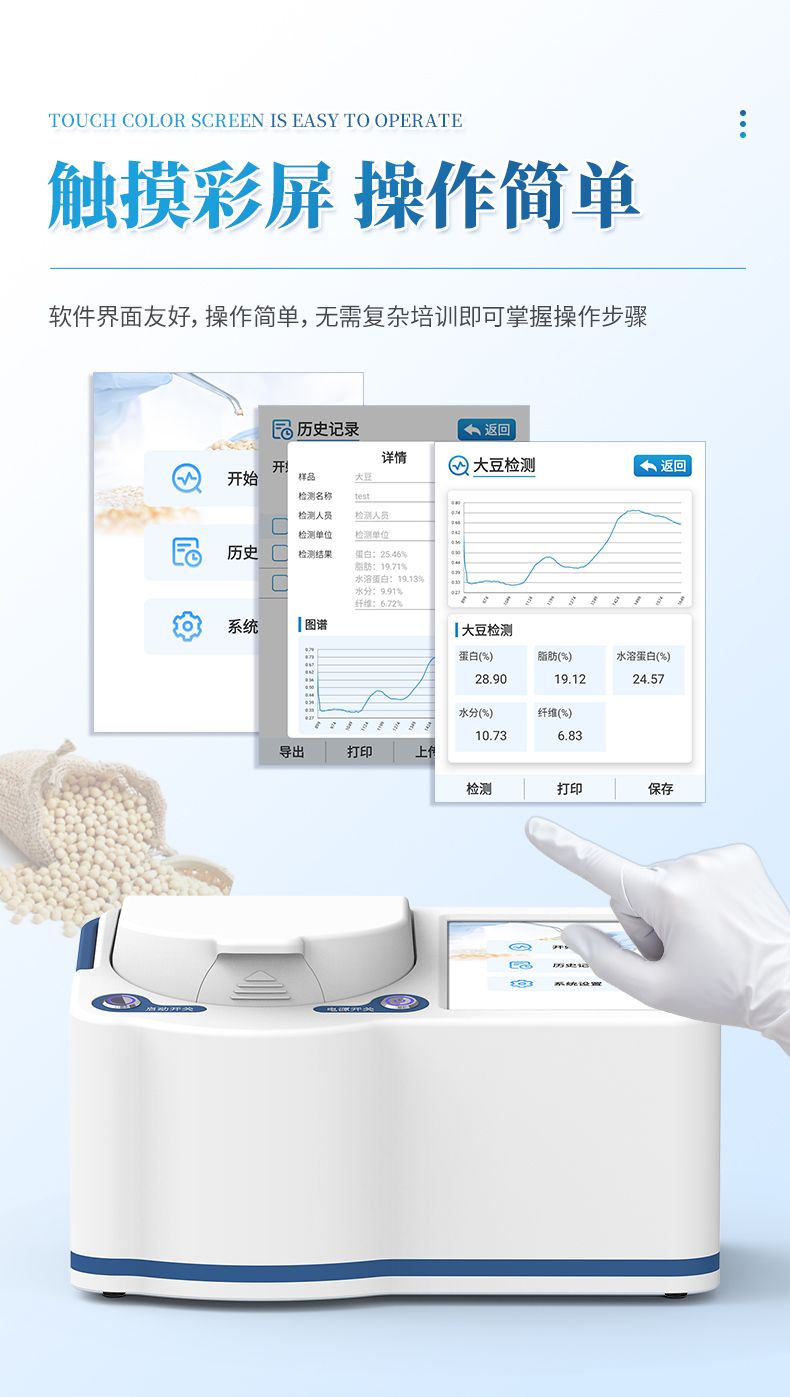 便攜式近紅外大豆蛋白儀采用先進(jìn)的近紅外光譜技術(shù),可同時(shí)無(wú)損檢測(cè)大豆中的蛋白質(zhì)、脂肪、水溶性蛋白、干基蛋白、纖維和水分等指標(biāo)。分析過(guò)程無(wú)需復(fù)雜前處理,數(shù)十秒內(nèi)即可得出結(jié)果,極大提升了檢測(cè)效率,降低了時(shí)間和人力成本。該儀器操作智能簡(jiǎn)便,結(jié)果穩(wěn)定可靠,是糧油加工、食品檢測(cè)、育種研發(fā)和貿(mào)易收購(gòu)等領(lǐng)域進(jìn)行原料驗(yàn)收、過(guò)程控制與品質(zhì)評(píng)定的理想工具。