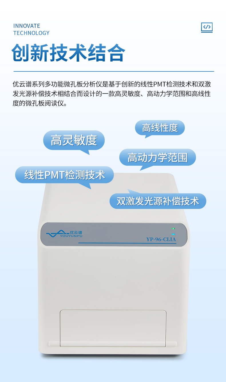 優(yōu)云譜系列多功能微孔板分析儀是基于創(chuàng)新的線性PMT檢測技術(shù)和雙激發(fā)光源補(bǔ)償技術(shù)相結(jié)合而設(shè)計(jì)的一款高靈敏度、高動(dòng)力學(xué)范圍和高線性度的微孔板閱讀儀。根據(jù)不同配置,可以實(shí)現(xiàn)化學(xué)發(fā)光(CLIA)、光激化學(xué)發(fā)光(LiCA)和時(shí)間分辨熒光(TRF)三種檢測模式??伸`活配置1到3種檢測模式,為研究人員提供一種靈活的解決方案。