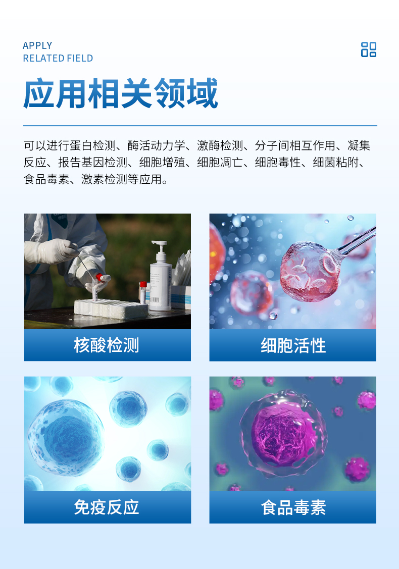 儀器廣泛應(yīng)用于核酸、免疫、細(xì)胞分析領(lǐng)域的相關(guān)研究,可以進(jìn)行蛋白檢測、酶活動(dòng)力學(xué)、激酶檢測、分子間相互作用、凝集反應(yīng)、報(bào)告基因檢測、細(xì)胞增殖、細(xì)胞凋亡、細(xì)胞毒性、細(xì)菌粘附、食品毒素及激素檢測等應(yīng)用。