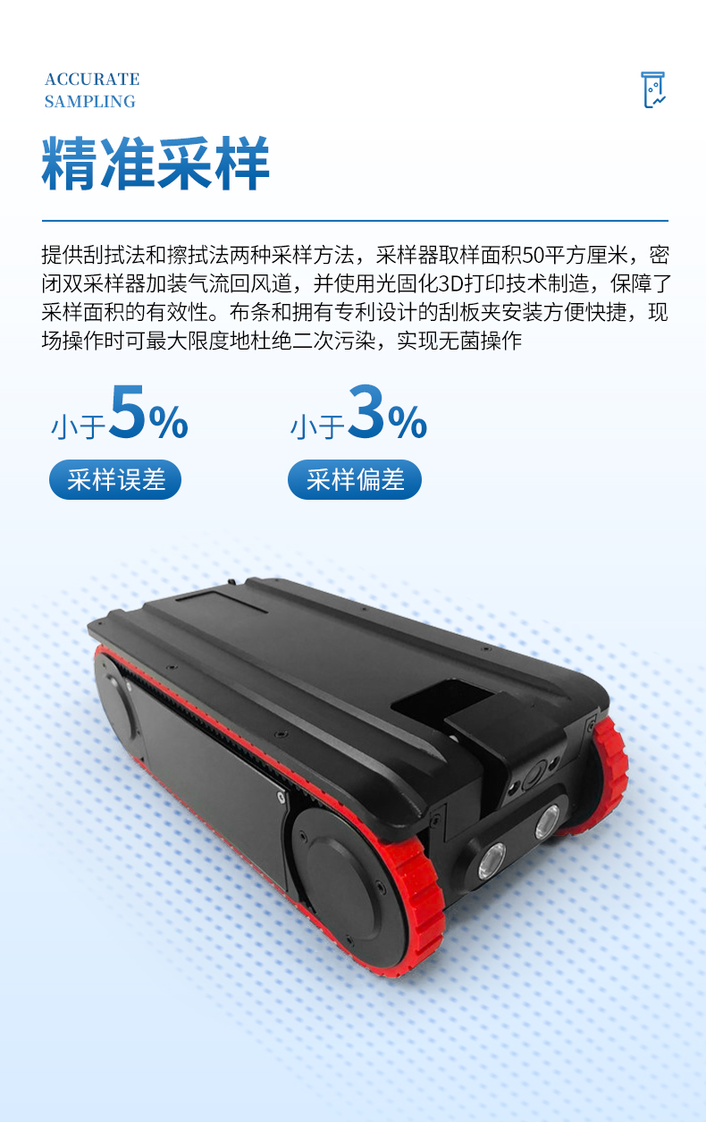 精準(zhǔn)采樣:提供刮拭法和擦拭法兩種采樣方法,采樣器取樣面積50平方厘米,密閉雙采樣器加裝氣流回風(fēng)道,并使用光固化3D打印技術(shù)制造,保障了采樣面積的有效性。布條和擁有專利設(shè)計的刮板夾安裝方便快捷,現(xiàn)場操作時可最大限度地杜絕二次污染,實現(xiàn)無菌操作。采樣誤差小于5%,采樣偏差小于3%。