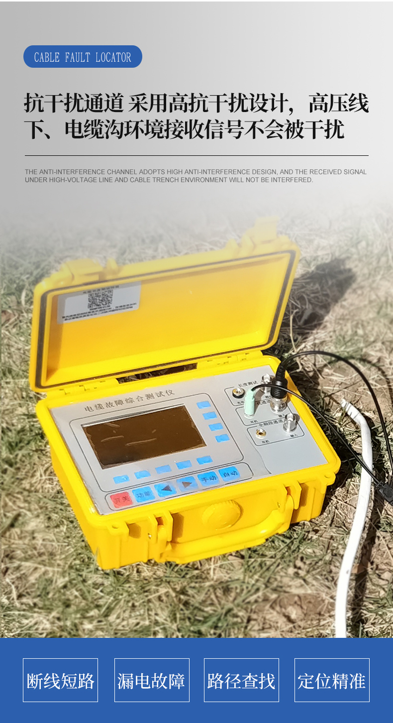 2、抗干擾通道:采用高性能濾波抗工頻干擾電路,斷電狀態(tài)下配合信號(hào)發(fā)生器定位直埋電纜對(duì)地漏電位置,測(cè)地埋電纜路徑走向及深度。