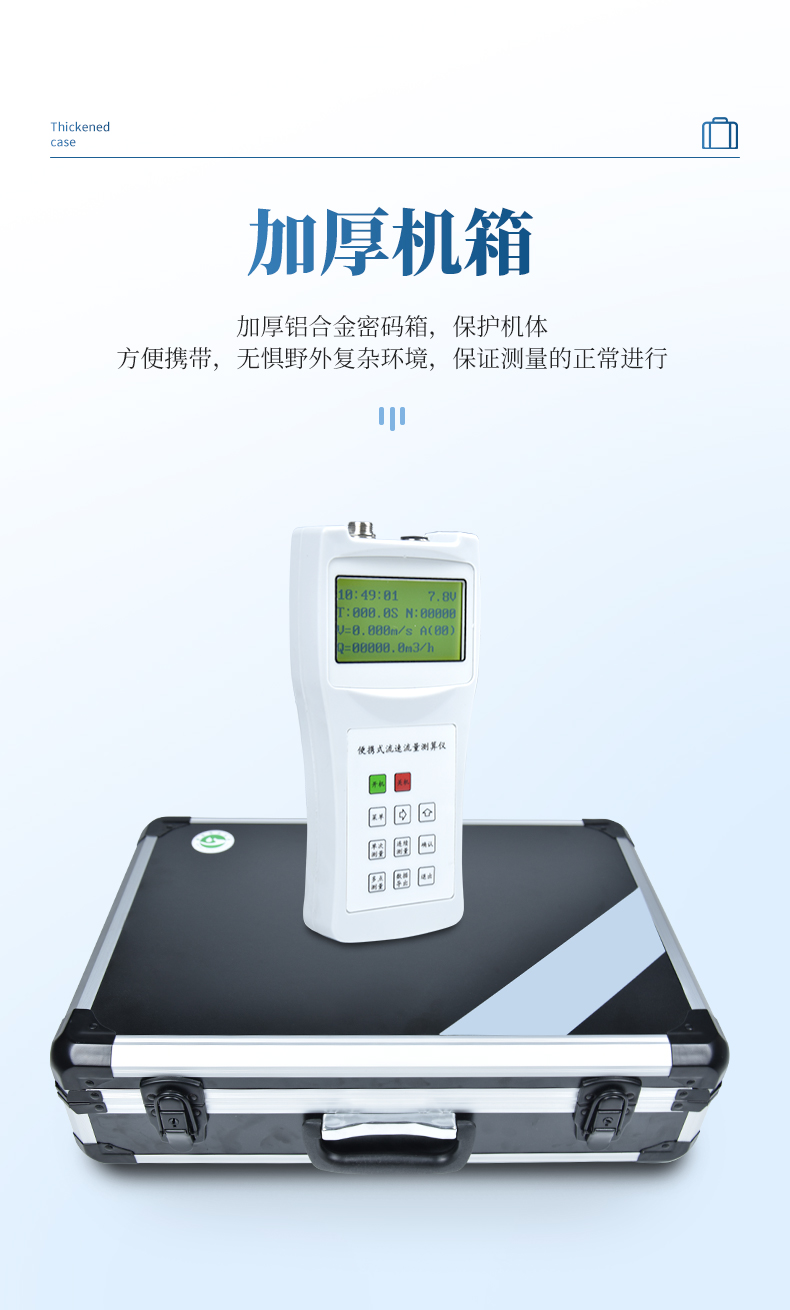 便攜式流速儀主要由LS1206B型旋槳式流速傳感器、流速測算儀、0.4m×4Ф16測桿組成。全套儀器置于高級鋁合金密碼箱內(nèi)。接通信號線,即可進行各明渠中流速的測量,并自動顯示流速。