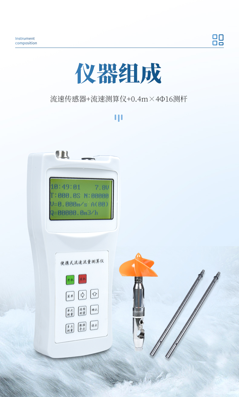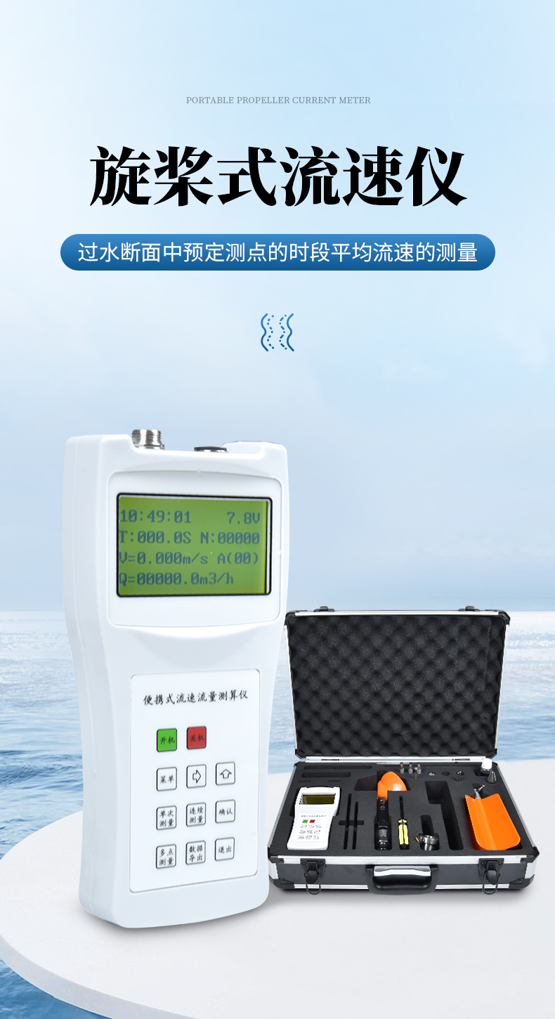 該儀器結構簡易、輕巧方便、耗電省、功能齊全、自動化程度高、穩(wěn)定可靠,符合國家明渠流量測量標準,配置60度高溫旋槳,是國內(nèi)目前新型的便攜式流速測量儀器。