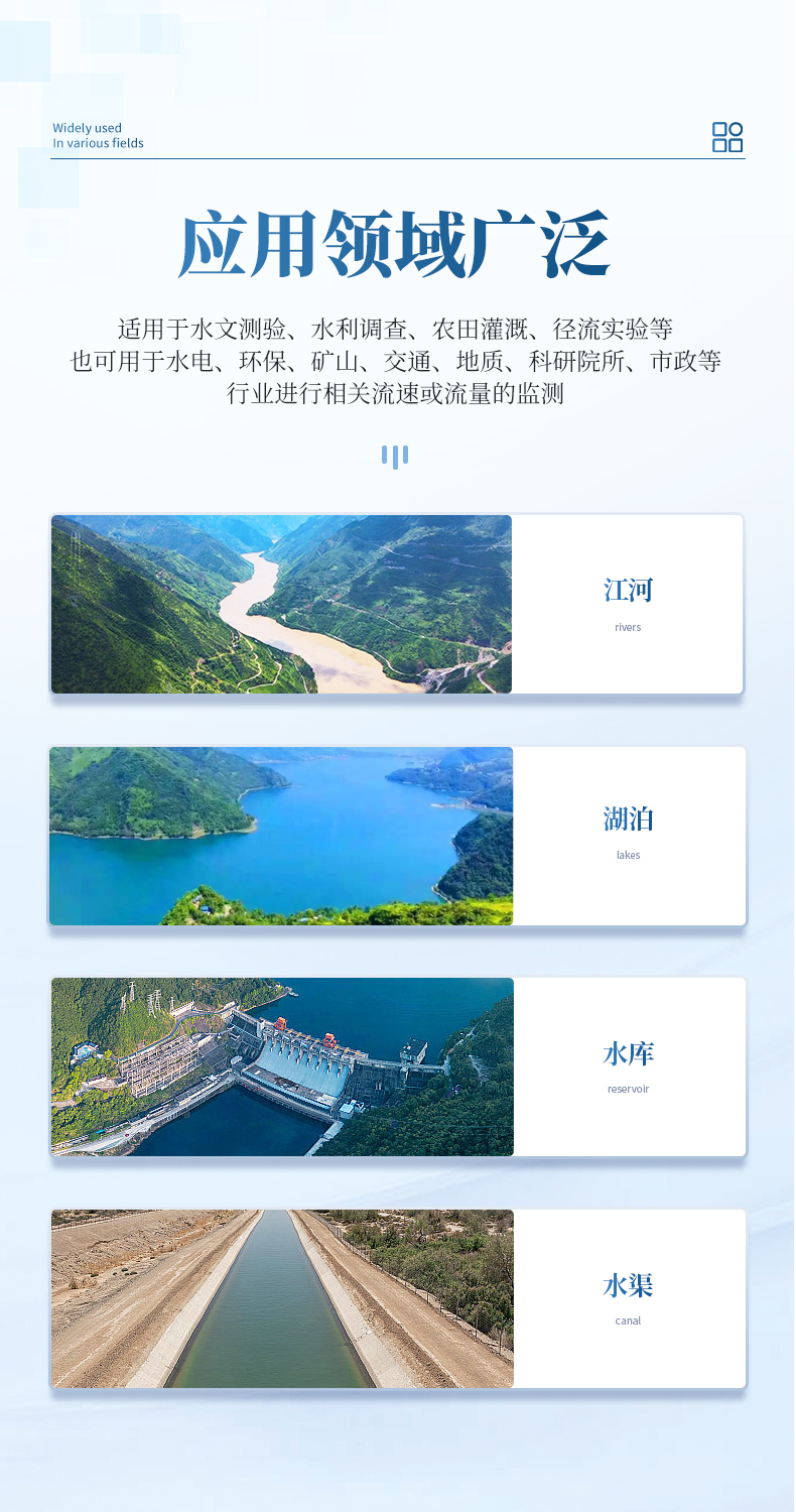 該流速儀廣泛適用于水文測驗、水利調查、農(nóng)田灌溉、徑流實驗等,亦可適用于水電、環(huán)保、礦山、交通、地質、科研院所、市政等行業(yè)進行相關流速或流量的監(jiān)測。