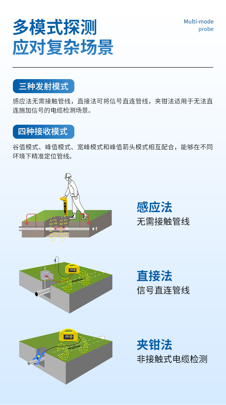 1、 發(fā)射機(jī)功能: 具有感應(yīng)法、直接法和夾鉗法三種信號施加模式,適合不同場合需要。