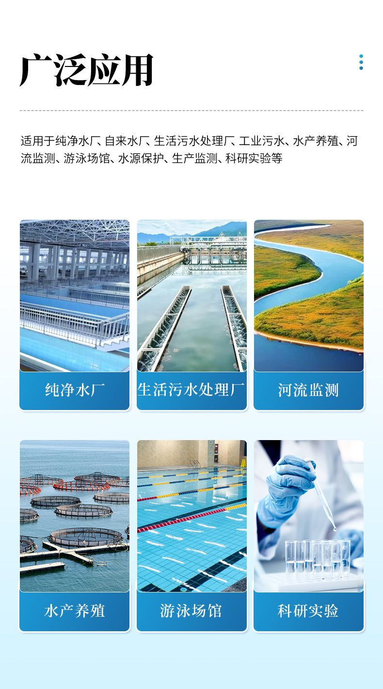 適用于純凈水廠、自來水廠、生活污水處理廠、工業(yè)污水、水產(chǎn)養(yǎng)殖、河流監(jiān)測、游泳場館、水源保護(hù)、生產(chǎn)監(jiān)測、科研實(shí)驗(yàn)等。