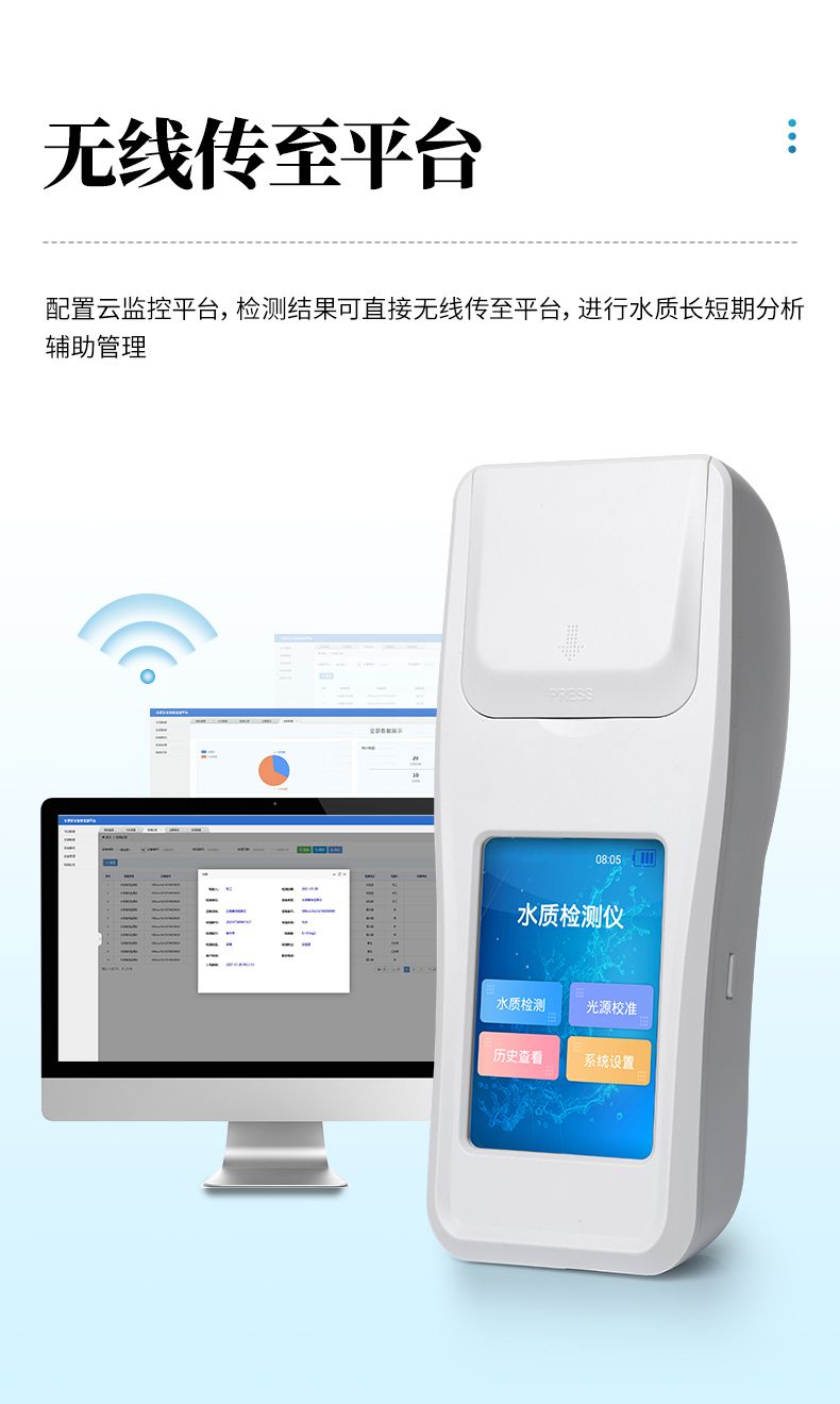 ②配置云監(jiān)控平臺,檢測結(jié)果可直接無線傳至平臺,進(jìn)行水質(zhì)長短期分析,輔助管理。