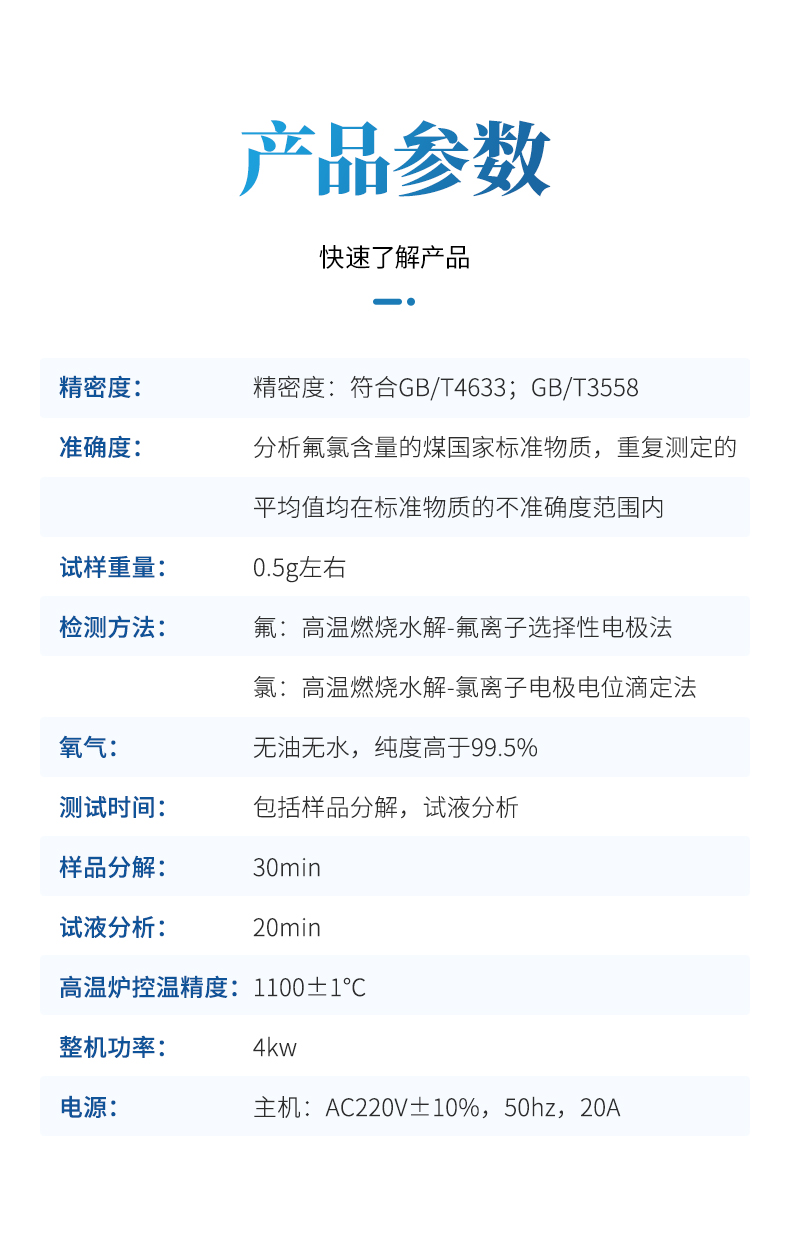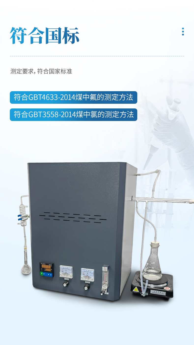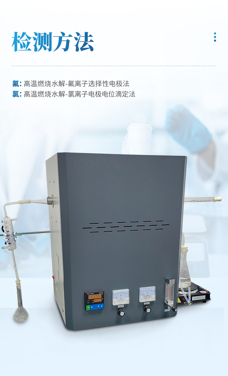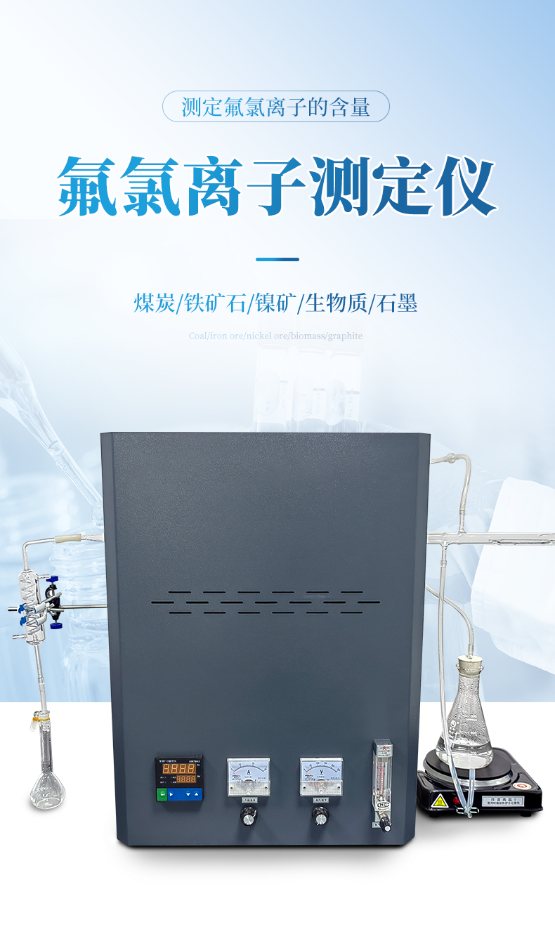 氟氯離子測(cè)定儀(高溫燃燒水解裝置、氟氯離子計(jì)、氟氯電極)主要用于測(cè)定煤炭、鐵礦石、鎳礦、生物質(zhì)、化工原料固體類及石墨中的氟、氯離子的含量,符合GBT4633-2014煤中氟的測(cè)定方法、GBT3558-2014煤中氯的測(cè)定方法國(guó)家標(biāo)準(zhǔn)要求。檢測(cè)原理:利用高溫燃燒水解—氟/氯離子選擇性電極法測(cè)定煤中總氟、氯含量。可供煤炭、電力、冶金和地質(zhì)勘探等部門的實(shí)驗(yàn)室使用。