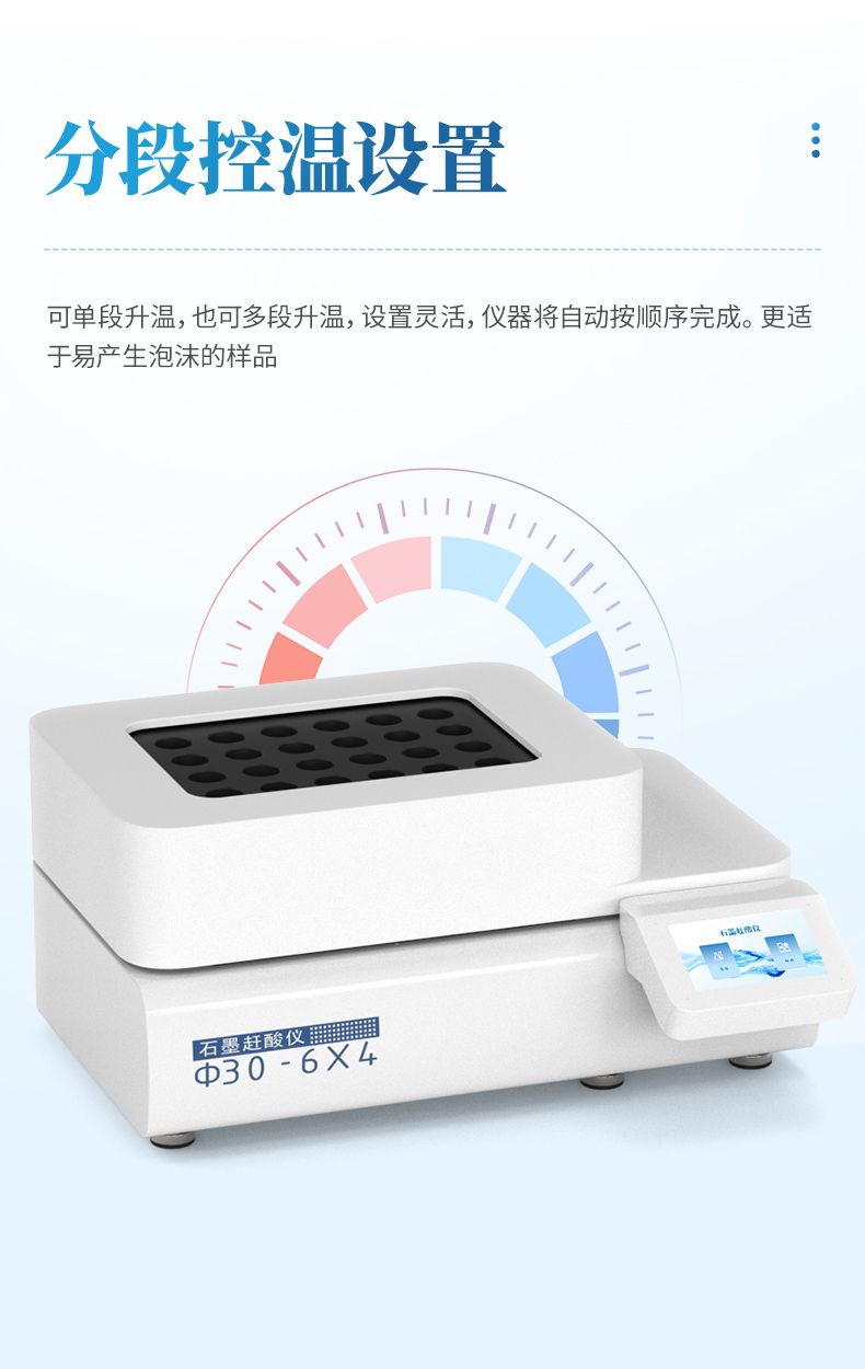 分段控溫設置,即可單段升溫,也可多段升溫,設置靈活,儀器將自動按順序完成。更適于易產(chǎn)生泡沫的樣品。