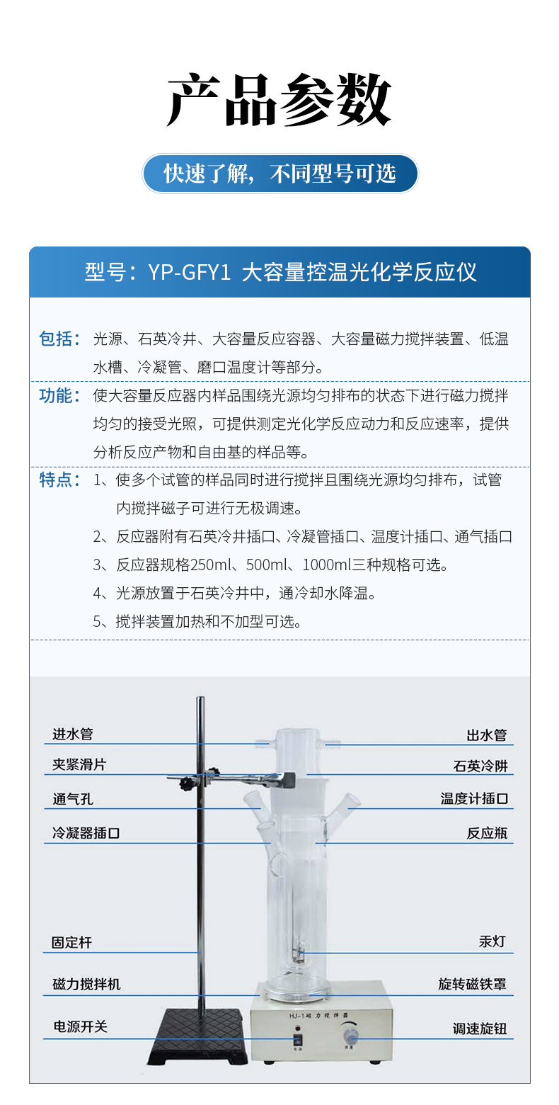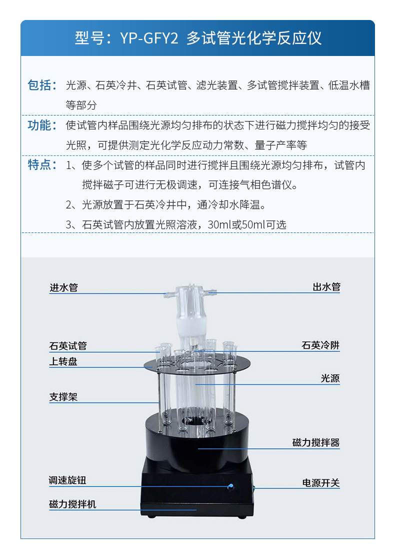 | 包括:光源、石英冷井、大容量反應容器、大容量磁力攪拌裝置、低溫水槽、冷凝管、磨口溫度計等部分。 功能:使大容量反應器內(nèi)樣品圍繞光源均勻排布的狀態(tài)下進行磁力攪拌均勻的接受光照,可提供測定光化學反應動力和反應速率,提供分析反應產(chǎn)物和自由基的樣品等。 特點:1、使多個試管的樣品同時進行攪拌且圍繞光源均勻排布,試管內(nèi)攪拌磁子可進行無極調(diào)速。 2、反應器附有石英冷井插口、冷凝管插口、溫度計插口、通氣插口 3、反應器規(guī)格250ml、500ml、1000ml三種規(guī)格可選。 4、光源放置于石英冷井中,通冷卻水降溫。 5、攪拌裝置加熱和不加型可選。 |