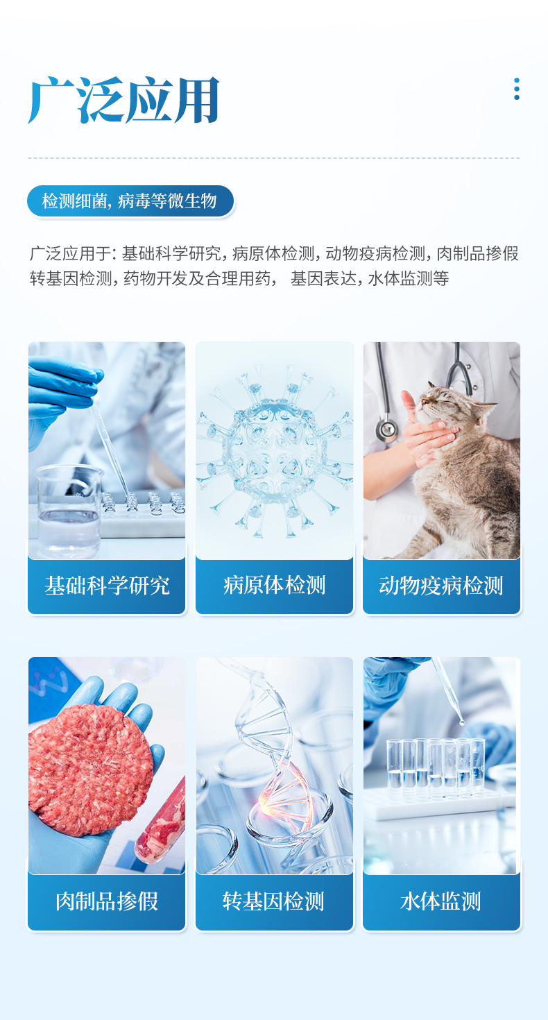儀器采用通用100uLPCR反應(yīng)管,降低耗材成本且易于獲得。廣泛應(yīng)用于:基礎(chǔ)科學(xué)研究,病原體檢測(cè),動(dòng)物疫病檢測(cè),肉制品摻假,轉(zhuǎn)基因檢測(cè),藥物開發(fā)及合理用藥, 基因表達(dá),水體監(jiān)測(cè)等
