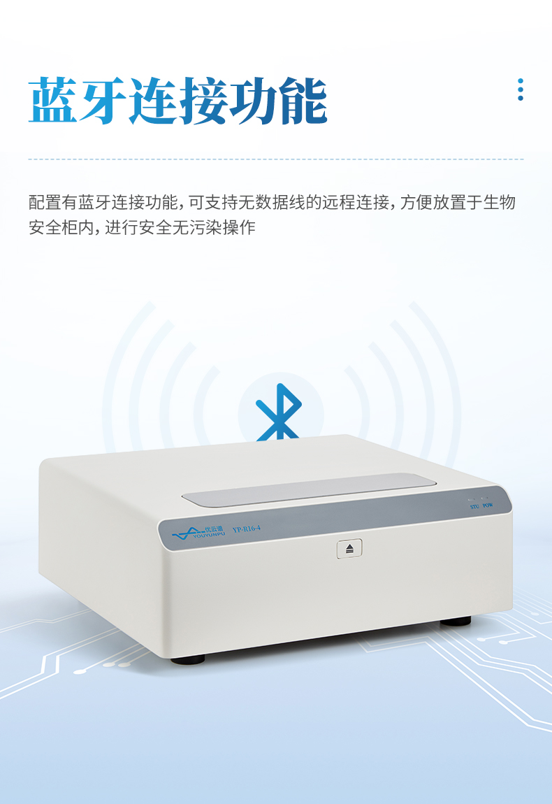 儀器配置有藍(lán)牙連接功能,可支持無數(shù)據(jù)線的遠(yuǎn)程連接,方便放置于生物安全柜內(nèi),進(jìn)行安全無污染操作。