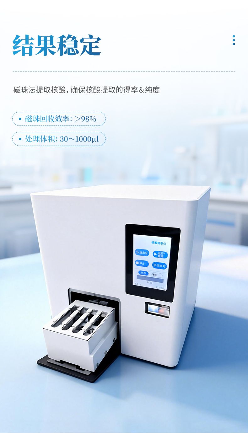 核酸提取儀通過磁珠法提取核酸,選擇相應的試劑盒就可以自動的從多種樣品材料如血液、組織、細胞中分離純化高純度的核酸。具有兼容性強(適配預封裝提取試劑盒,也可適配單頭份試劑)、提取速度快、提取回收率高、操作簡便的優(yōu)點,是分子生物學實驗室檢測試驗的得力“助手”??蓮V泛應用于科學研究、分子診斷、動植物疫病檢測等領域。
