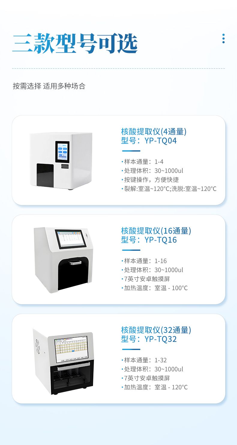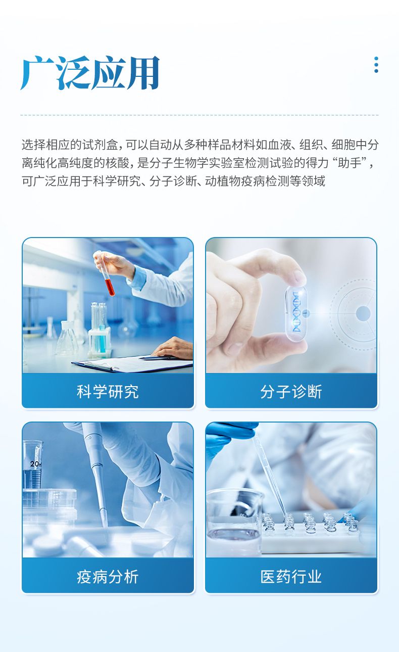 核酸提取儀通過磁珠法提取核酸,選擇相應(yīng)的試劑盒就可以自動的從多種樣品材料如血液、組織、細(xì)胞中分離純化高純度的核酸。具有兼容性強(適配預(yù)封裝提取試劑盒,也可適配單頭份試劑)、提取速度快、提取回收率高、操作簡便的優(yōu)點,是分子生物學(xué)實驗室檢測試驗的得力“助手”??蓮V泛應(yīng)用于科學(xué)研究、分子診斷、動植物疫病檢測等領(lǐng)域。