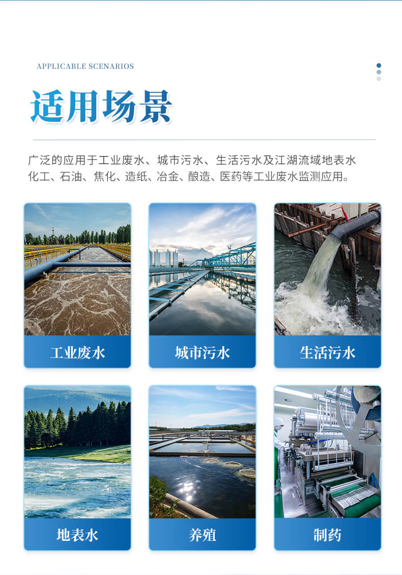 能夠廣泛的應(yīng)用于各種行業(yè)(工業(yè)廢水、城市污水、生活污水及江湖流域地表水)廢水的檢測,可適合不同用戶的多種需求,可在化工、石油、焦化、造紙、冶金、釀造、醫(yī)藥等工業(yè)廢水及各種生活污水監(jiān)測應(yīng)用。