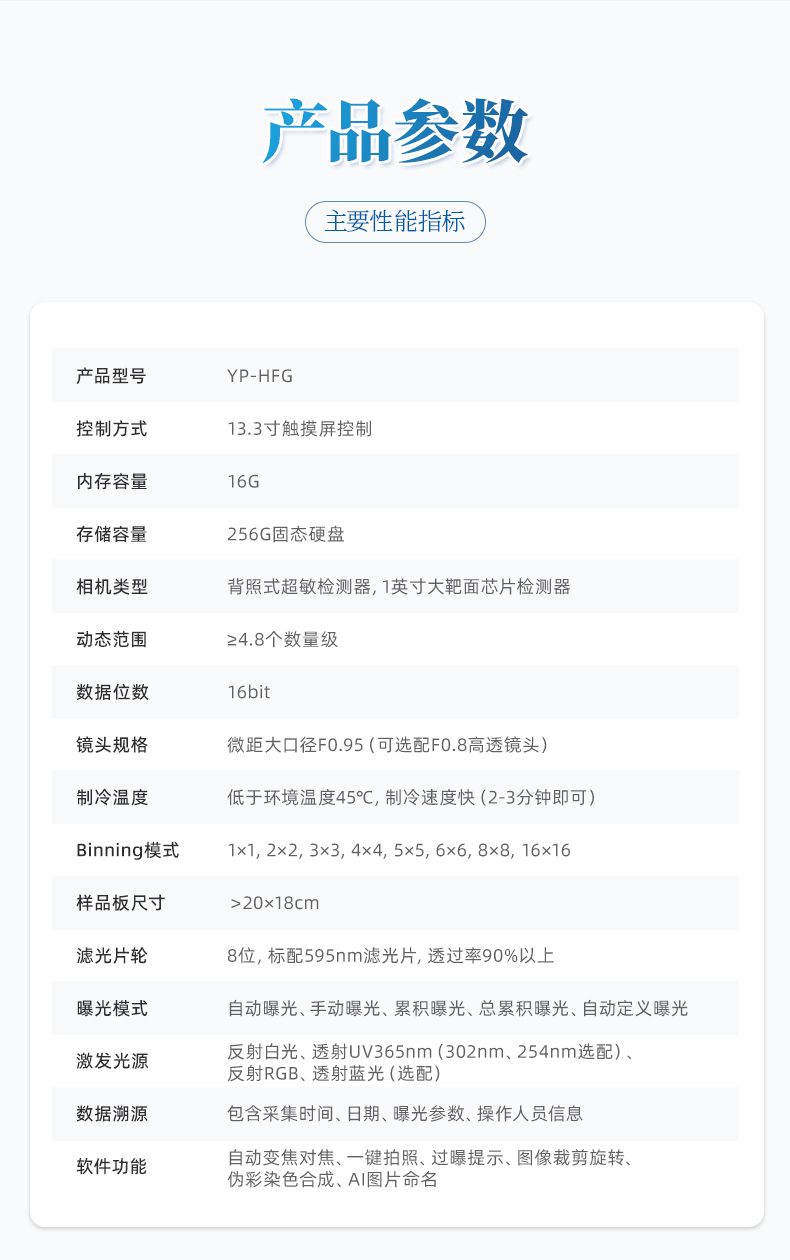 采用 13.3 寸觸摸屏控制,內(nèi)存 16G,256G 固態(tài)硬盤,使儀器具有更強大圖像計算及 處理能力,配合圖像采集軟件操作簡捷直觀,軟件具有自動采集信號及彩色 marker,并進 行自己處理合成功能;曝光模式分為自動曝光、手動曝光、累積曝光、總累積曝光以及自 動定義曝光功能。配合圖像分析軟件可對圖像信號進行定性定量分析。