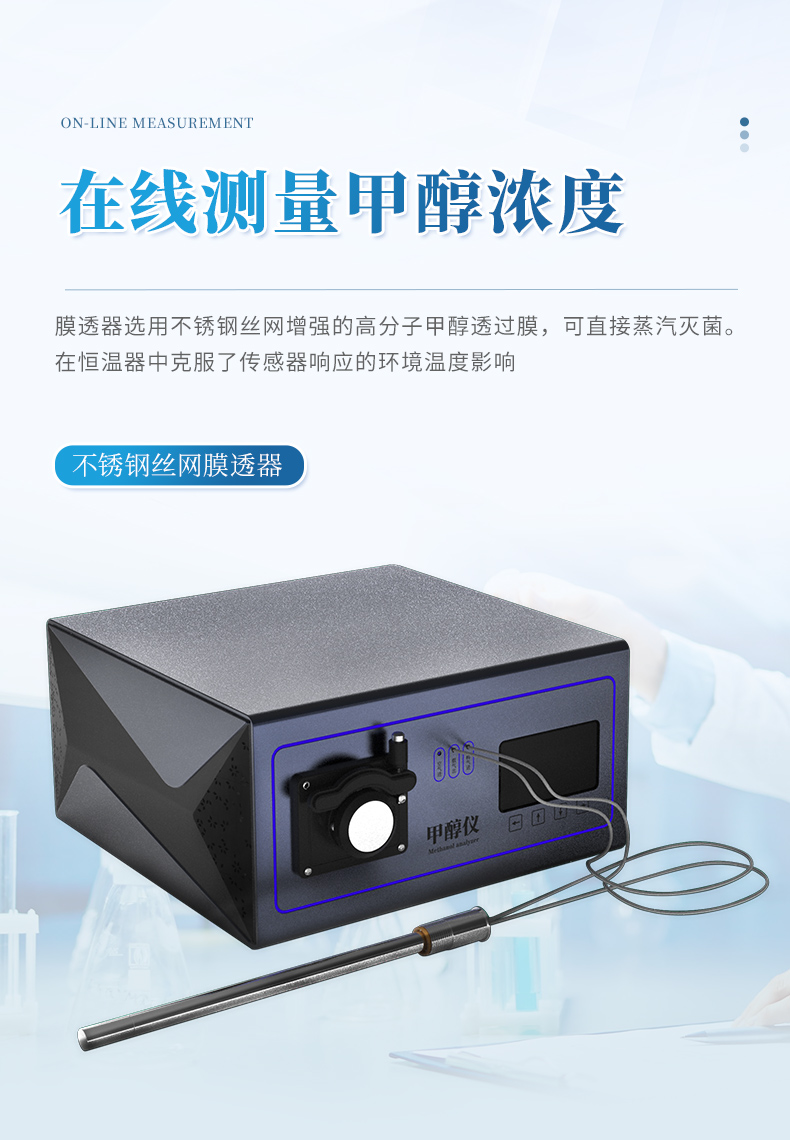 在線測量發(fā)酵液中甲醇濃度,膜透器選用了不銹鋼絲網(wǎng)增強的高分子甲醇透過膜,可直接蒸汽滅菌。檢測傳感器工作在恒溫器中克服了傳感器響應(yīng) 的環(huán)境溫度影響,脫透器有φ25和φ12mm插入直徑可選,和有多種插入長 度可選,儀器具有非線性校正,程控標(biāo)定,高低位報警,數(shù)字溫度補償和兩級密碼保護重要數(shù)據(jù)及菜單組態(tài)等功能