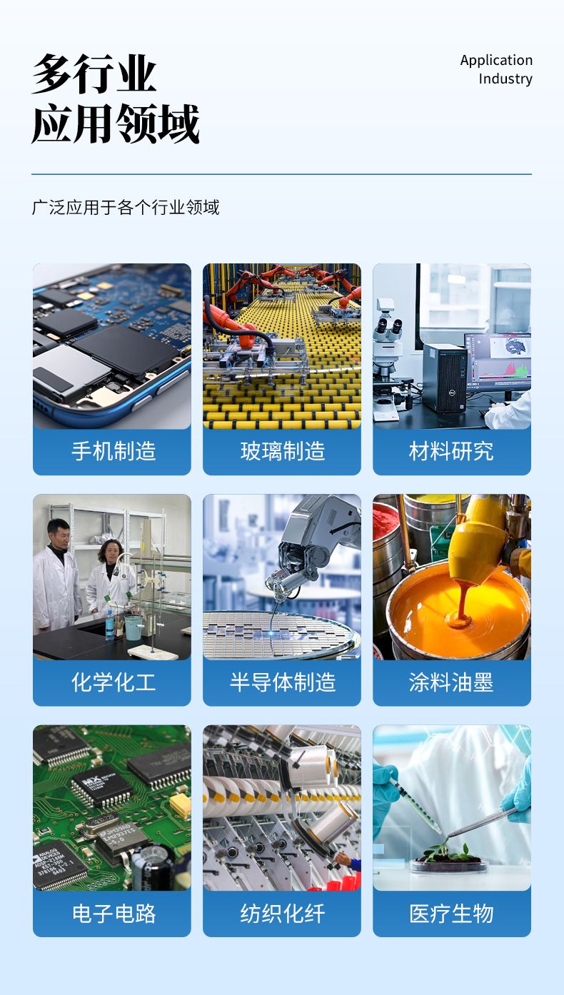 接觸角測量儀廣泛應用于各個行業(yè)領(lǐng)域,在手機制造、玻璃制造、表面處理、材料研究、化學化工、半導體制造、涂料油墨、電子電路、紡織纖維、醫(yī)療生物等領(lǐng)域,接觸角測量已經(jīng)成為了一項評估表面性能的重要儀器。