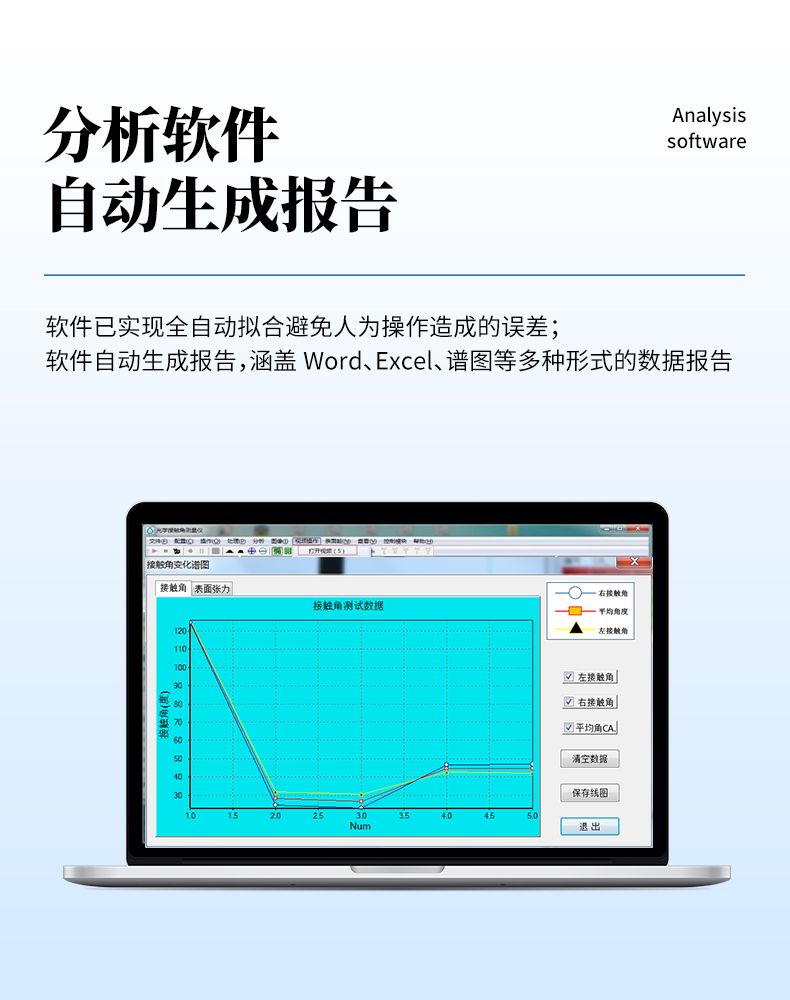 具備雙邊接觸角測量快速擬合功能,更全面量分析液體與固體的表面潤濕性能、更準確的分析表面的