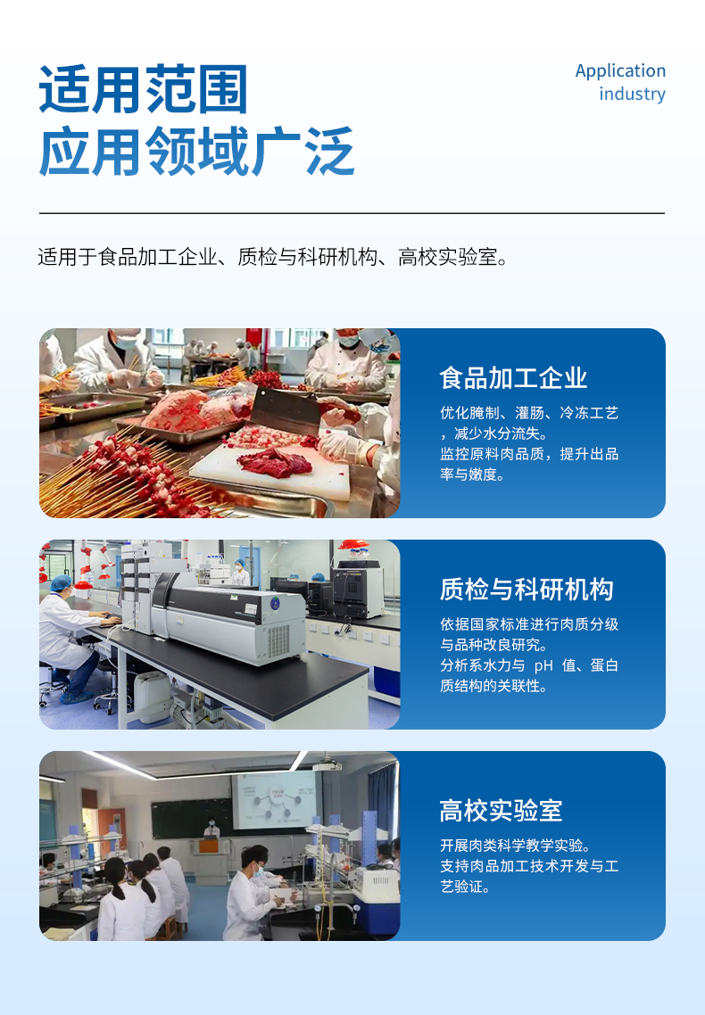 肌肉系水力的高低,取決于宰后肌肉的 PH。國(guó)內(nèi)通常采用加壓重量法來(lái)度量肌 肉失水率,以估計(jì)肌肉的系水力,即失水率越高,系水力越低。系水力(%)=(壓前肉樣重-壓后肉樣重)一壓前肉樣重 x100%。系水力:指肌肉蛋白質(zhì)在外力作用 下保持水分的能力采用貯存損失 熟肉率及失水率測(cè)定肌肉的系水力。應(yīng)用于食品包裝廠家、質(zhì)檢、商檢、大學(xué)、 科研等部門(mén)。