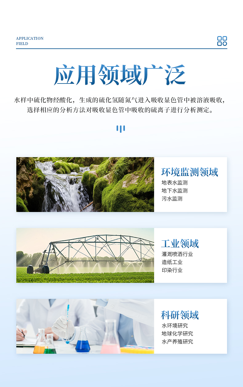 水樣中的硫化物經(jīng)酸化,生成的硫化氫隨載氣(氮氣)進入吸收瓶/吸收顯色管中被吸收溶液(乙酸鋅-乙酸鈉溶液或2%氫氧化鈉溶液)吸收,選擇相應(yīng)的分析方法對吸收瓶/吸收顯色管中吸收的硫離子進行分析測定。