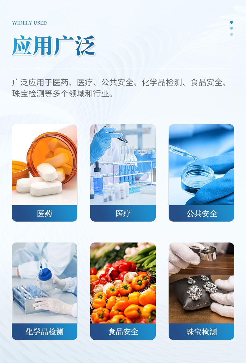 適用于現(xiàn)場(chǎng)快速檢測(cè),廣泛應(yīng)用于醫(yī)藥、公共安全、化學(xué)品檢測(cè)、食品安全、珠寶檢測(cè)及工業(yè)材料分析等多重領(lǐng)域和行業(yè)。