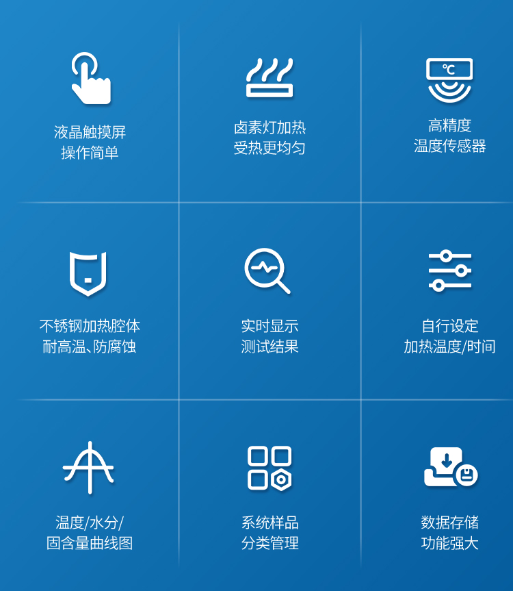 該系列快速水分測定儀應(yīng)用了國際烘箱干燥法原理,測定結(jié)果與烘箱法水分測定具有良好的一致性,工作效率卻遠(yuǎn)遠(yuǎn)高于烘箱法水分測定,一般樣品只需要幾分鐘即可測量完畢,因此受到廣大用戶的青睞與好評。