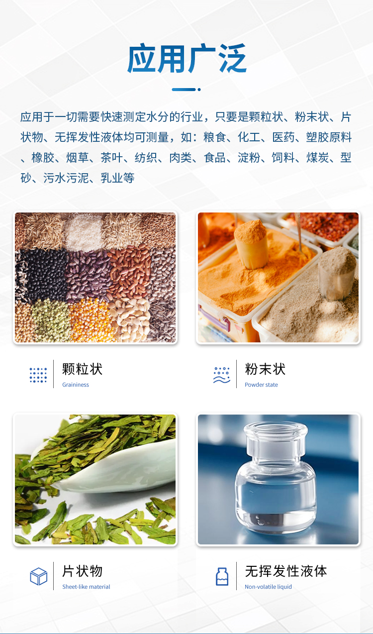 該系列快速水分測定儀應(yīng)用于一切需要快速測定水分的行業(yè),只要是顆粒狀、粉末狀、片狀物、無揮發(fā)性液體均可測量,如:糧食、化工、醫(yī)藥、塑膠原料、橡膠、煙草、茶葉、紡織、肉類、食品、淀粉、飼料、煤炭、型砂、污水污泥、乳業(yè)等等;