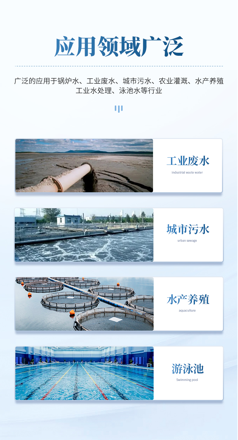 能夠廣泛的應(yīng)用于鍋爐水、工業(yè)廢水、城市污水、農(nóng)業(yè)灌溉、水產(chǎn)養(yǎng)殖、工業(yè)水處理、泳池水等行業(yè)。