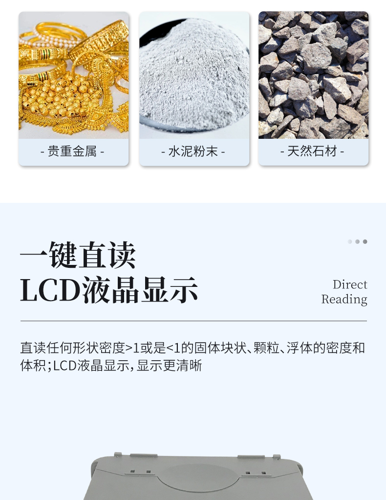 1.直讀任何形狀密度>1或是<1的固體塊狀、顆粒、浮體的密度和體積