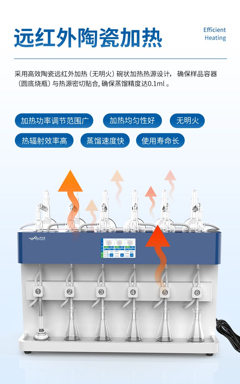 3、加熱模塊采用遠(yuǎn)紅外陶瓷輻射加熱方式,碗狀加熱熱源設(shè)計(jì),確保樣品容器(圓底燒瓶)與熱源密切貼合,加熱功率調(diào)節(jié)范圍廣、加熱均勻性好、熱輻射效率高,蒸餾速度快、使用壽命長(zhǎng)。