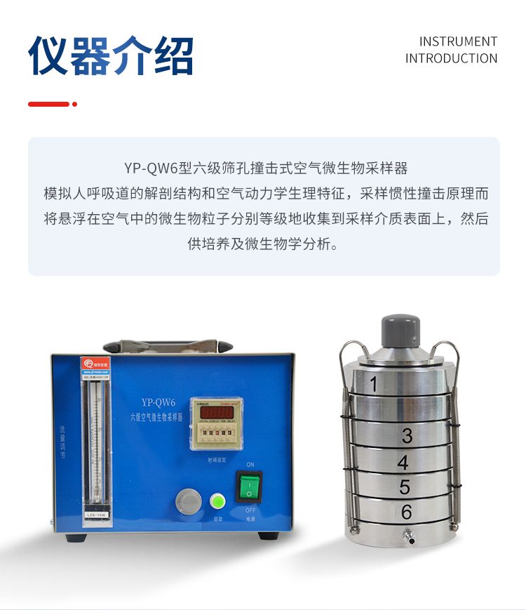 YP-QW6型六級篩孔撞擊式空氣微生物采樣器模擬人呼吸道的解剖結(jié)構(gòu)和空氣動力學(xué)生理特征,采樣慣性撞擊原理而將懸浮在空氣中的微生物粒子分別等級地收集到采樣介質(zhì)表面上,然后供培養(yǎng)及微生物學(xué)分析。