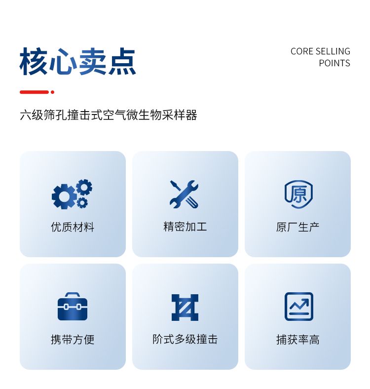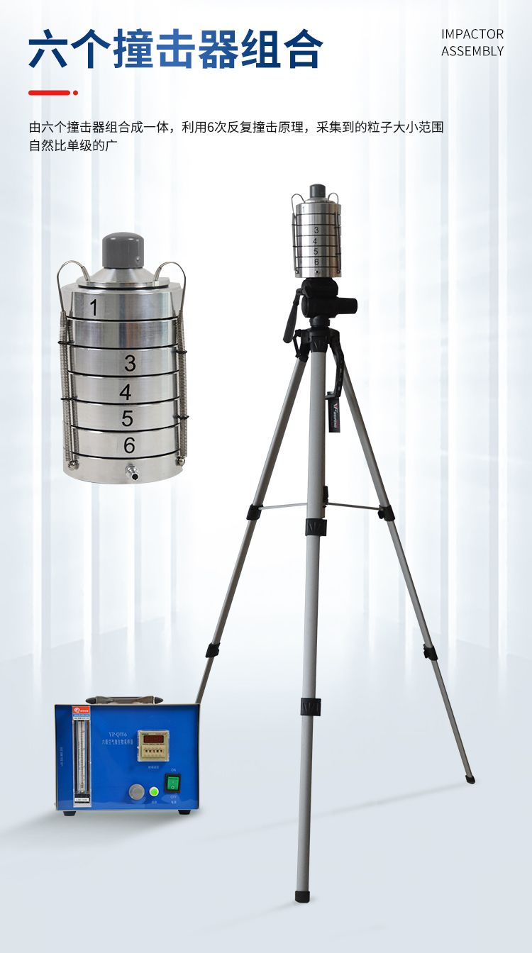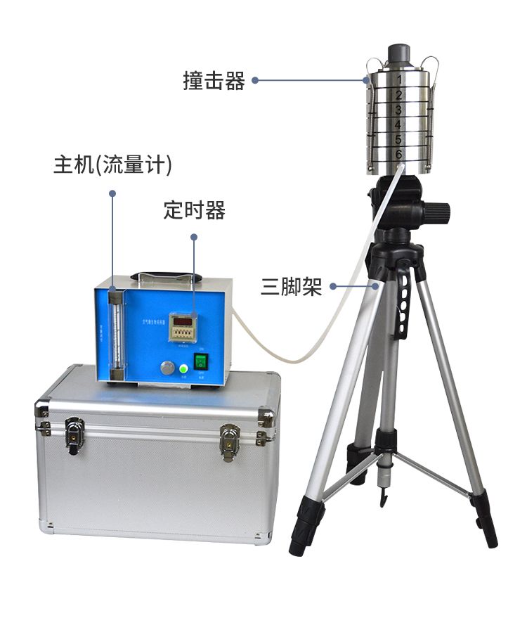 整個儀器是由撞擊器、主機(流量計)、定時器、三腳架組成。撞擊器是6層有微小孔眼的鋁合金圓盤。圓盤下放瓊脂平皿,每圓盤間有密封膠圈,在通過三個彈簧掛 鉤把圓盤牢固地聯(lián)在一起。每個圓盤上有400個成環(huán)行排列、逐層減小、尺寸精確的小孔,標(biāo)準(zhǔn)采樣流量為1立方呎(28.3L/min)。當(dāng)含有微生物粒子 的氣流進入最上層的采樣口后,由于氣流的逐層增高,不同大小的微生物粒子按空氣動力學(xué)特征分別撞擊在相應(yīng)的瓊脂表面上。捕獲在各級上的粒子大小范圍是由該 級孔眼的氣流速度和上一級的粒子截阻率而決定的。第1、2級類似人的上呼吸道捕獲的粒子,第3~6級類似人的下呼吸道捕獲的粒子,這就相當(dāng)程度上復(fù)制了這 些粒子在呼吸道的穿透作用和沉著部位。
