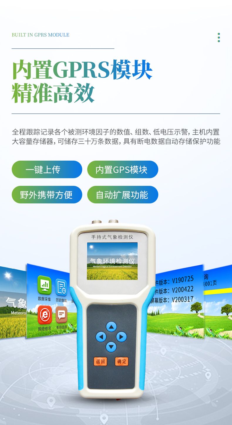 采用一體化結(jié)構(gòu)設(shè)計(jì),內(nèi)置GPS模塊,GPRS模塊,外置SD卡,能準(zhǔn)確的測量出被測地點(diǎn)的地理信息,界面除顯示所測環(huán)境參數(shù)、存儲(chǔ)數(shù)據(jù)外,還可顯示測點(diǎn)的經(jīng)緯度。通過內(nèi)置的GPRS一鍵上傳被測點(diǎn)的環(huán)境因子測量數(shù)據(jù)等。同時(shí)還可以通過外置SD卡直接把數(shù)據(jù)導(dǎo)出到電腦上。(可選)