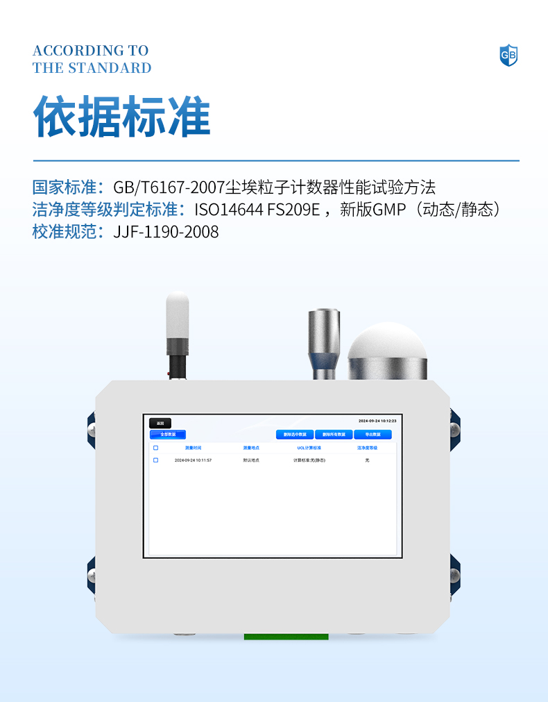 智能塵埃粒子計數(shù)器,其置信度測量檢定標(biāo)準(zhǔn)按照國標(biāo)GB/T6167-2007和校準(zhǔn)規(guī)范JJF1190-2008規(guī)定的條件,對凈化級別進(jìn)行自動判斷。一次采樣可同時測得六個粒徑通道的塵埃粒子數(shù),并同時顯示六個粒徑通道粒子的數(shù)目及其變化情況。