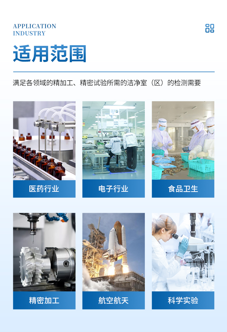 滿足醫(yī)藥行業(yè)(制藥廠、藥檢所、醫(yī)院等);電子行業(yè)(半導(dǎo)體工廠、精密機(jī)械的生產(chǎn)加工等);食品衛(wèi)生行業(yè)(乳制品、塑封肉食品、調(diào)味食品、農(nóng)產(chǎn)品等的精加工);過濾器的生產(chǎn)廠家(檢驗(yàn)過濾器的質(zhì)量及效率等);光學(xué)及航空航天等領(lǐng)域的精加工、精密試驗(yàn)、生物工程等所需的潔凈室(區(qū))的檢測需要。