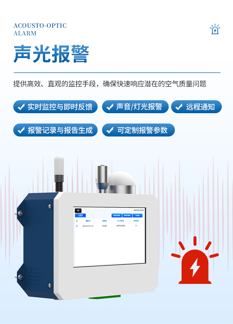 1、聲光報警:通過設(shè)置報警參數(shù)實(shí)現(xiàn)顆粒數(shù)的聲光報警。