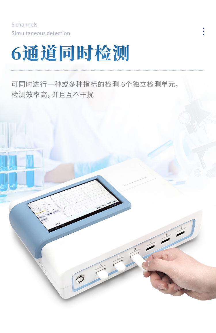 5、6通道設(shè)計(jì),可同時(shí)進(jìn)行一種或多種指標(biāo)的檢測(cè),6個(gè)獨(dú)立檢測(cè)單元,檢測(cè)效率高,并且互不干擾;
