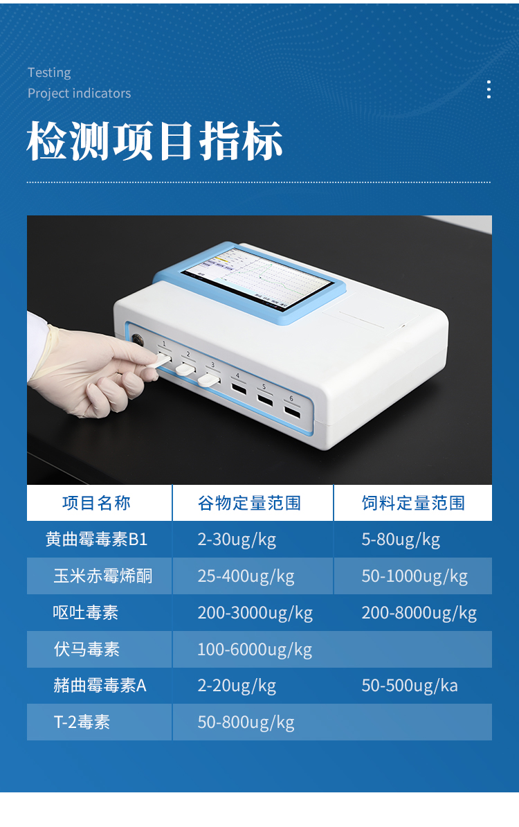 重金屬鎘 | 0-1000ug/kg | 玉米、小麥、麥麩、豆粕、花生粕、玉米胚芽粕、膨化玉米、DDGS、噴漿玉米皮及成品飼料 |