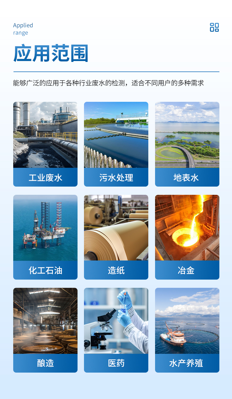 能夠廣泛的應用于各種行業(yè)(工業(yè)廢水、城市污水、生活污水及江湖流域地表水)廢水的檢測,可適合不同用戶的多種需求,可在化工、石油、焦化、造紙、冶金、釀造、醫(yī)藥等工業(yè)廢水及各種生活污水監(jiān)測應用。