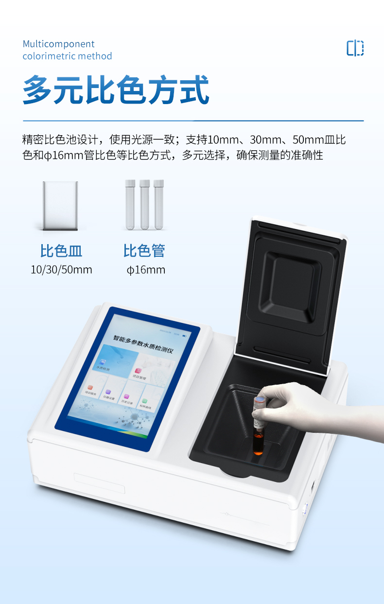 5、支持10mm、30mm、50mm皿比色和φ16mm管比色等比色方式,多元選擇,確保測量的準確性;