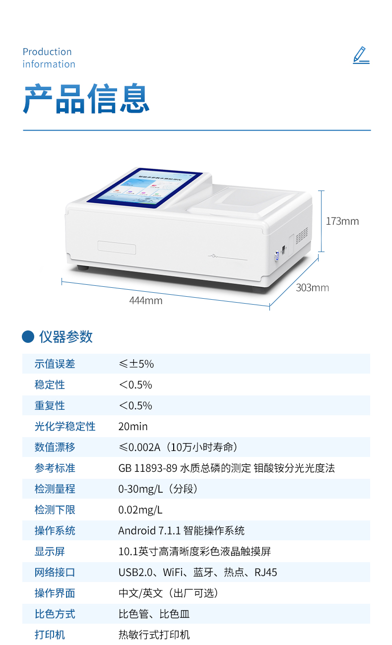智能總磷測定儀是參考《GB 11893-89 水質(zhì)總磷的測定 鉬酸銨分光光度法》標準設(shè)計制造,主要檢測水質(zhì)總磷濃度指標;本儀器兼具智能數(shù)據(jù)分析功能,圖表、列表顯示數(shù)據(jù),分析一目了然;高清晰度彩色液晶觸摸顯示屏,Android智能操作系統(tǒng),中文顯示界面,中英文鍵盤,人性化操作,使用更簡單。