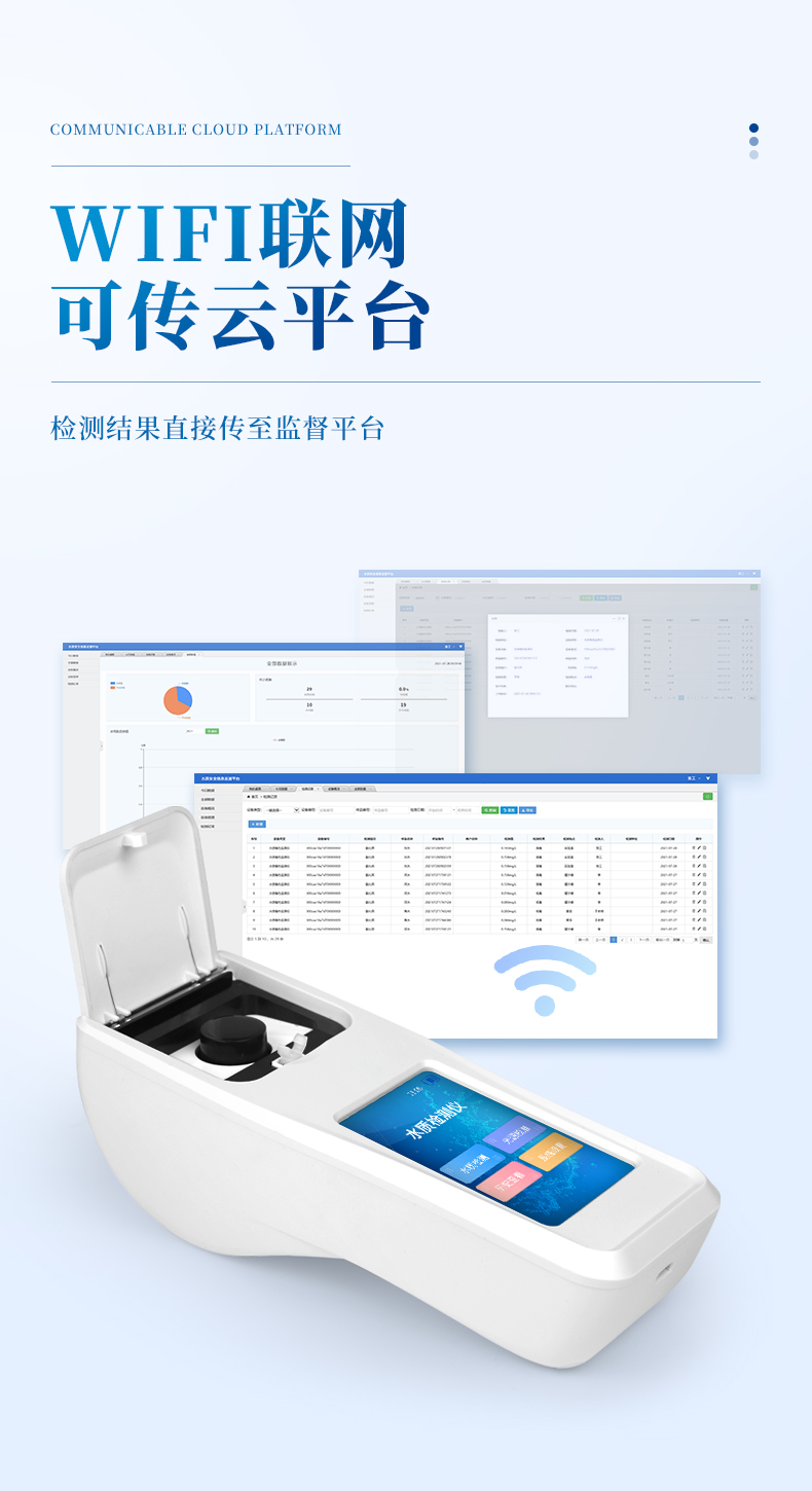 ②配置云監(jiān)控平臺(tái),檢測(cè)結(jié)果可直接無(wú)線傳至平臺(tái),進(jìn)行水質(zhì)長(zhǎng)短期分析,輔助管理。